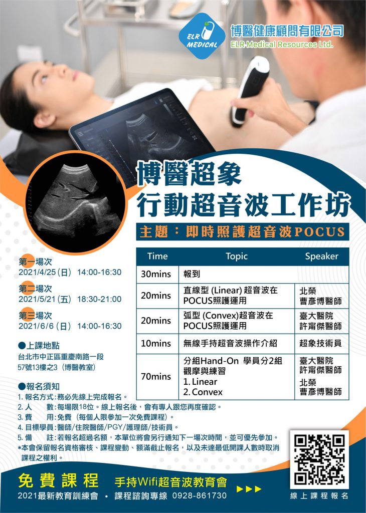 特別邀請臺大許甯傑主任及北榮曹彥博醫師重量級講師,將針對即時照護超音波POCUS進行詳細解說,讓學員清楚知道如何能在Wifi無線超音波協助下及時進行Screen及Define相關處置。課程安排每位學員有大量的實作練習機會,能夠確實了解及熟練如何運用超音波。